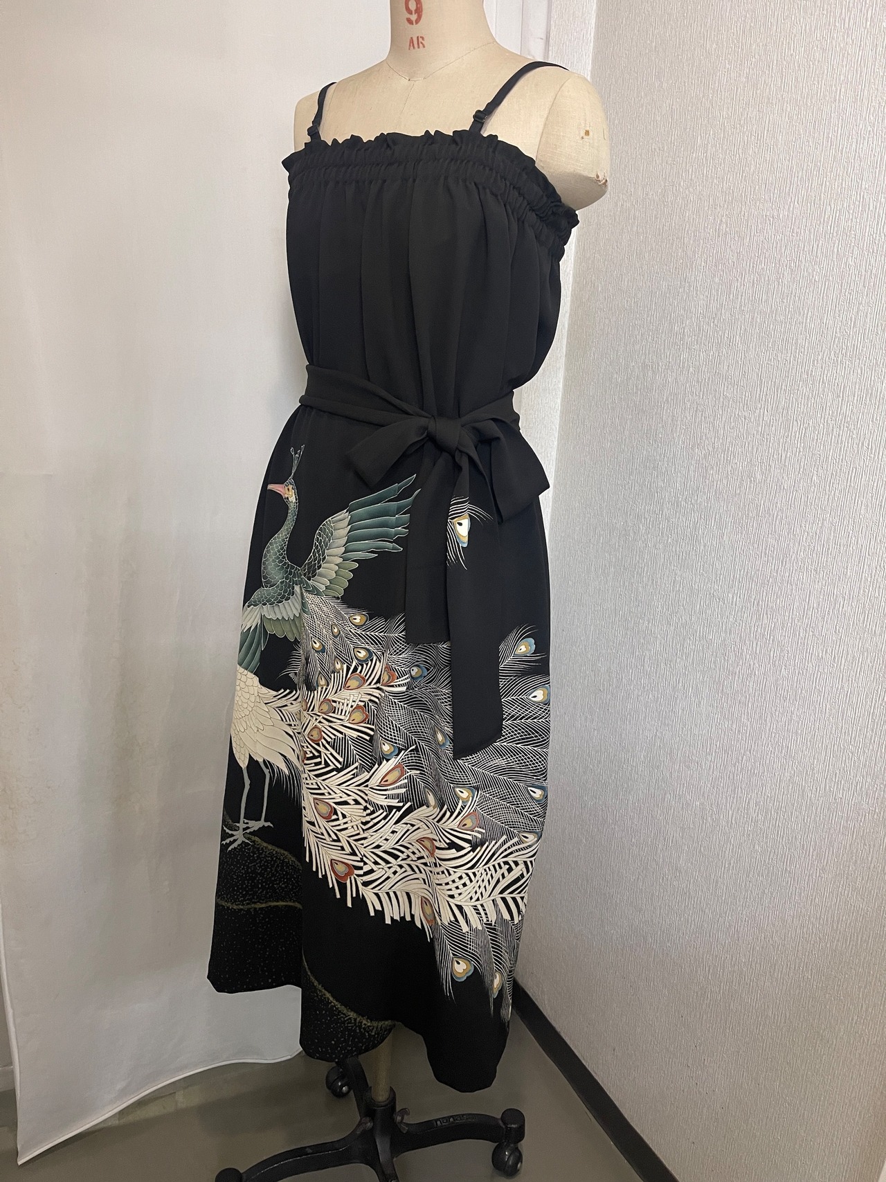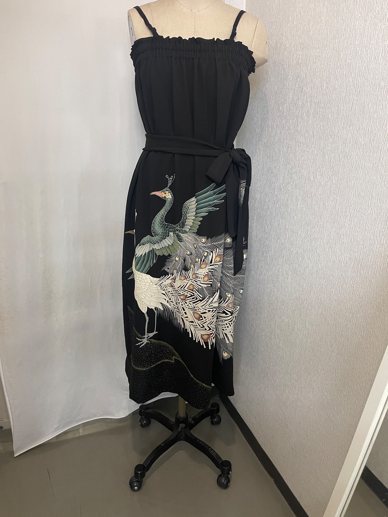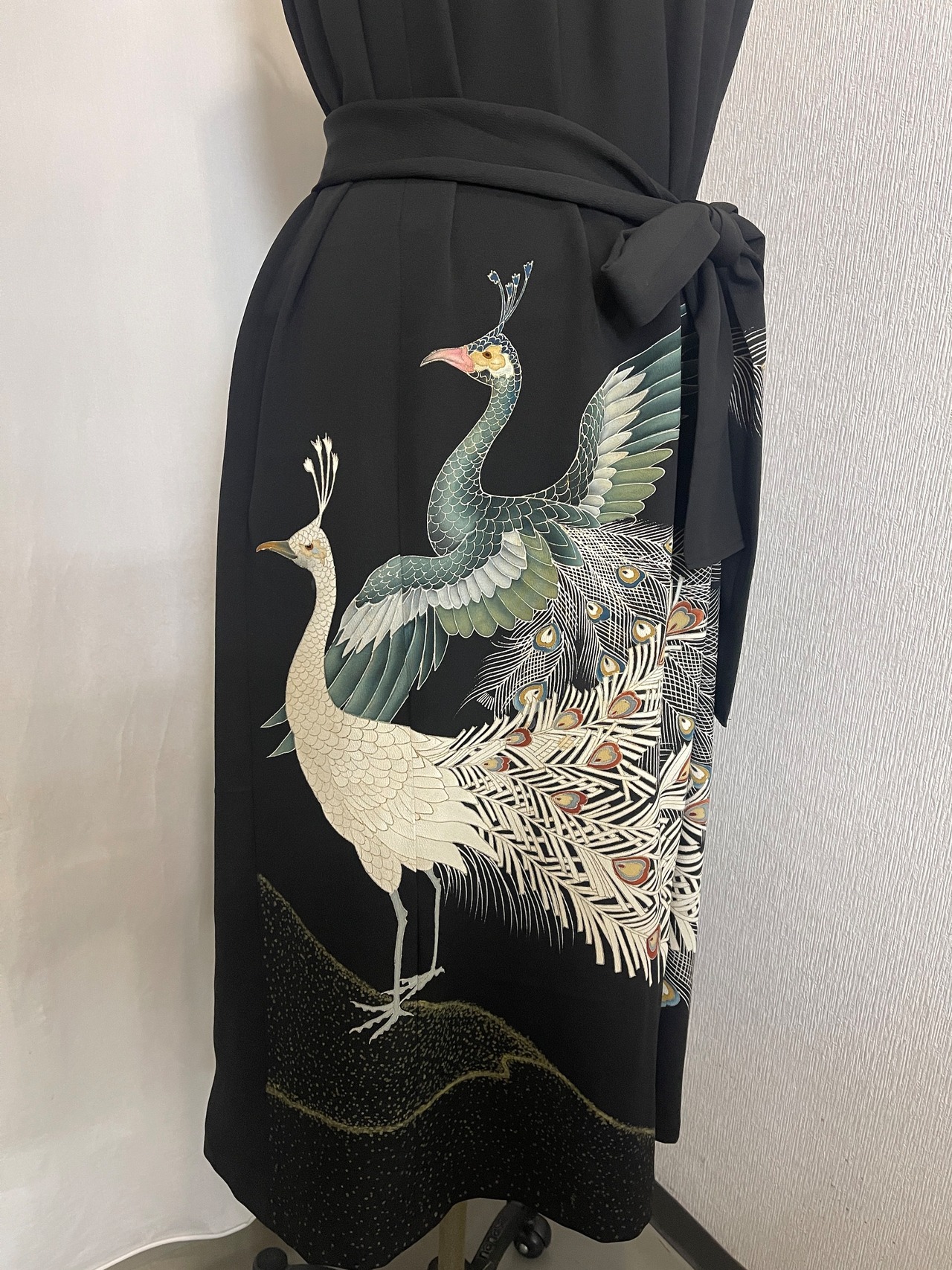 着物リメイク 1点もの 黒留袖 孔雀柄 リゾートワンピース 正絹縮緬