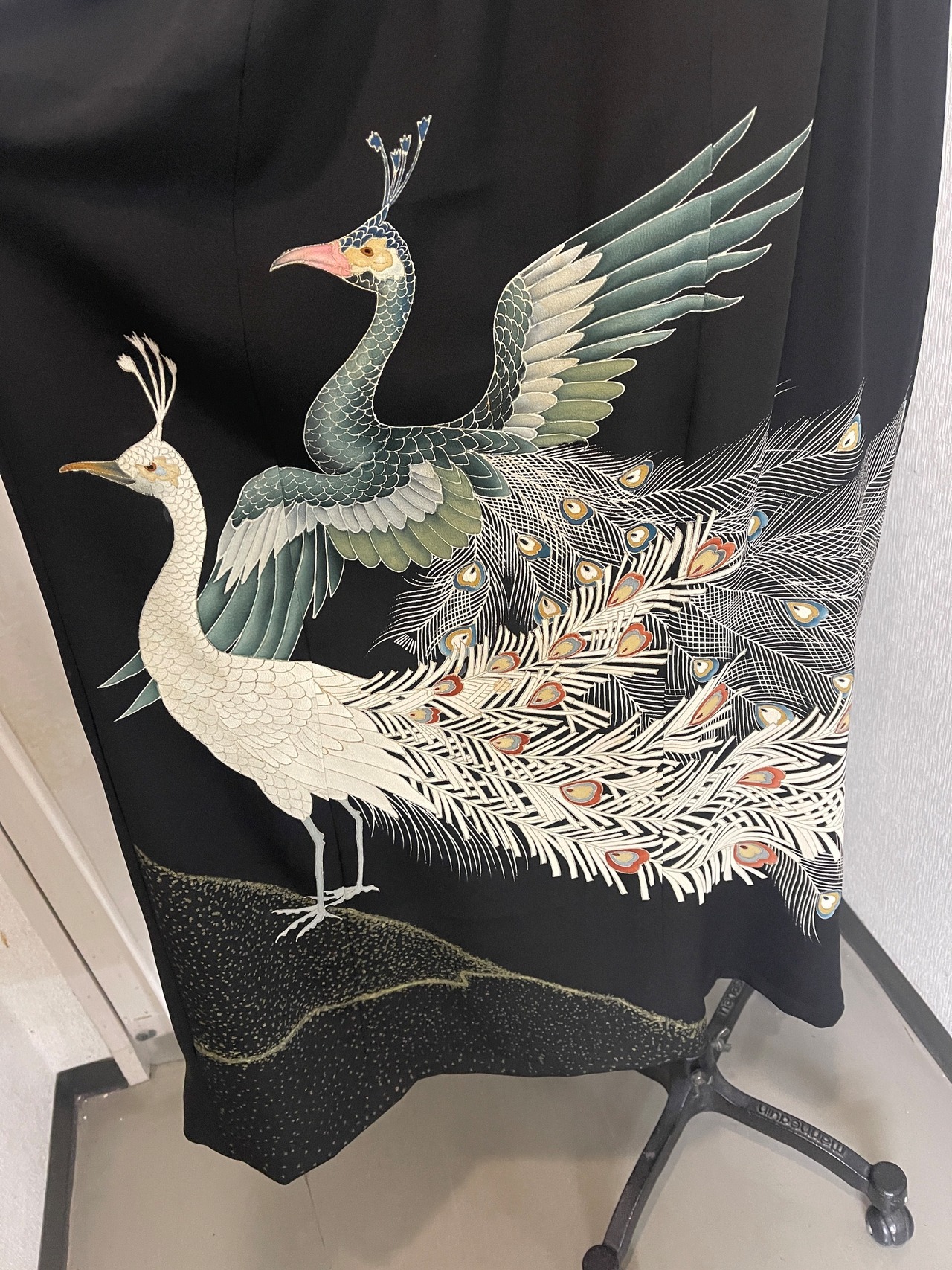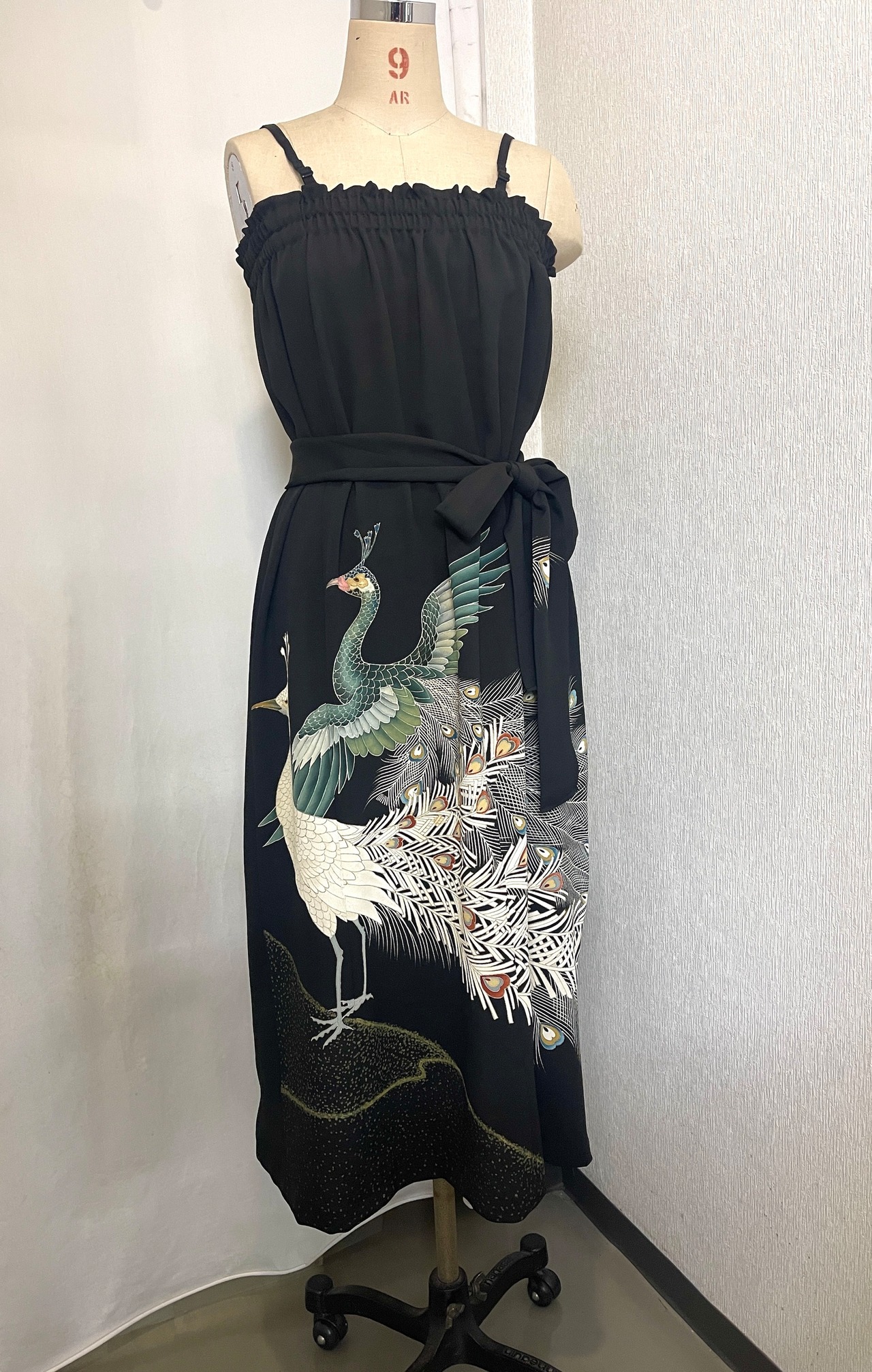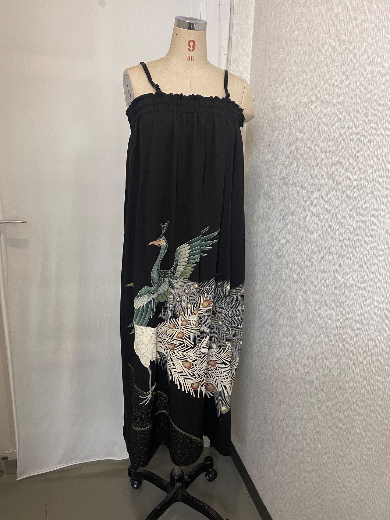 着物リメイク 1点もの 黒留袖 孔雀柄 リゾートワンピース 正絹縮緬
