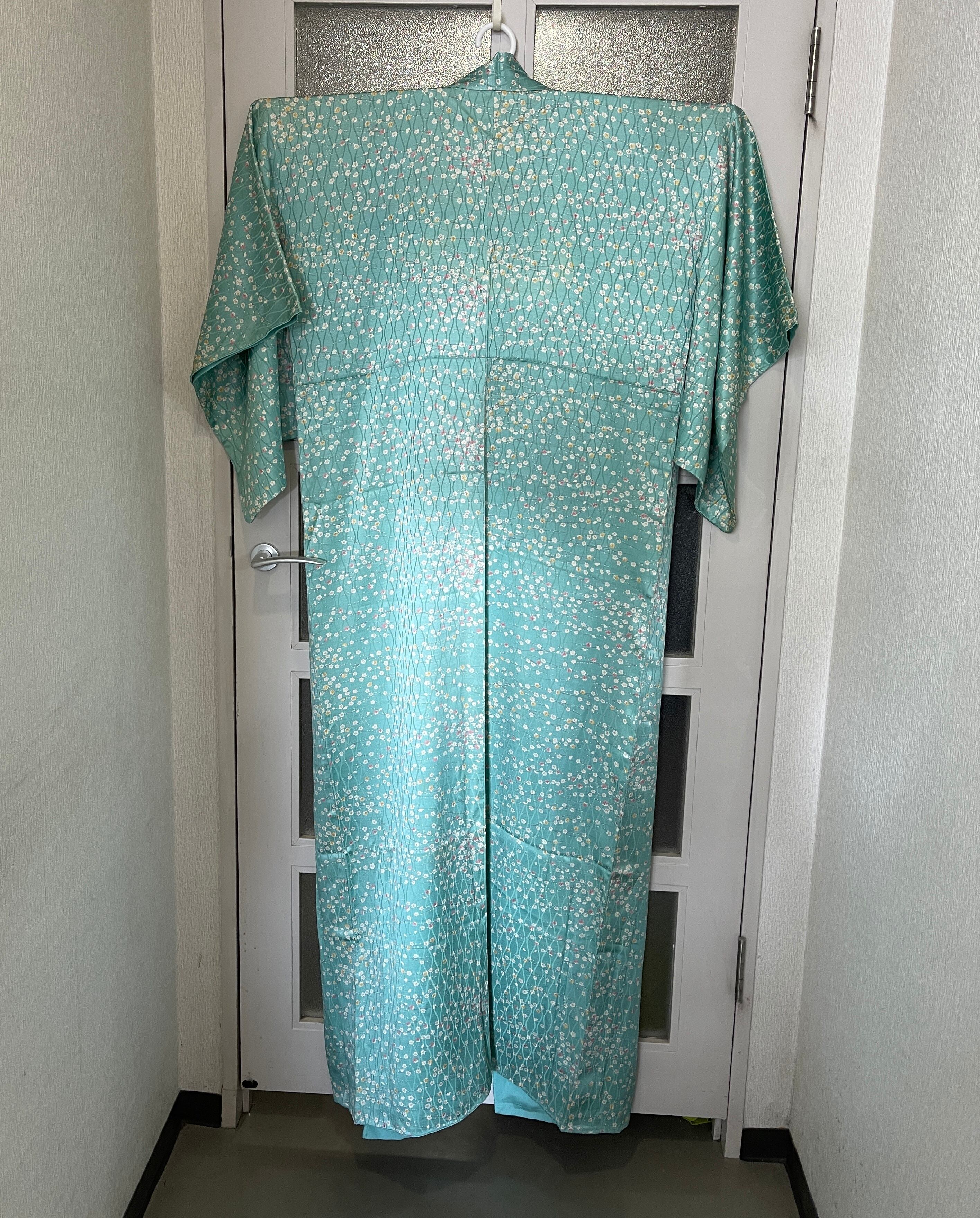 さわやかで可愛いミントグリーンに水玉のような梅の花柄の着物を