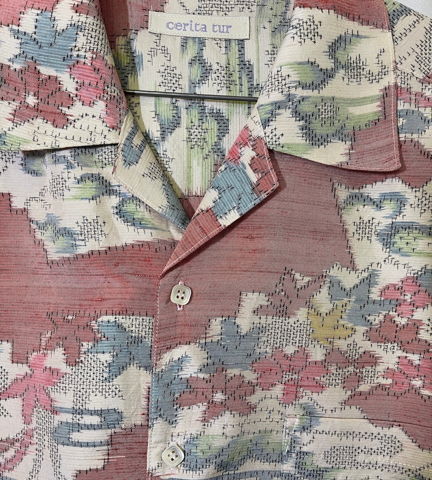 珍しい赤系の紬の着物でアロハシャツに仕上げました。
